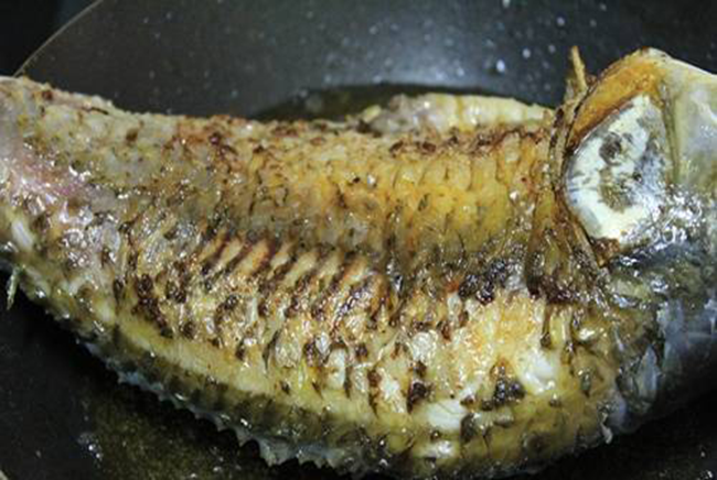 2, Đánh vảy, làm sạch lòng cá chép với ít muối hạt. Sau đó rửa sạch lại lần nữa, để ráo và đem rán sơ để da cá hơi vàng và thịt cá săn lại.